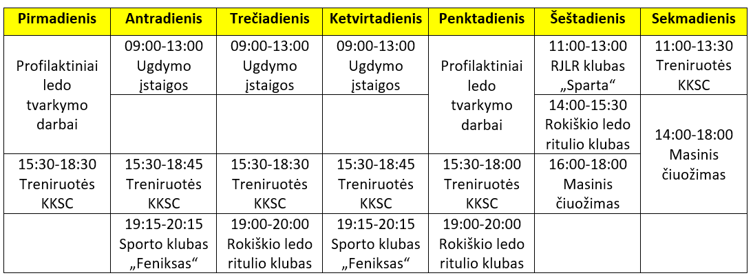 PASTABA: Vykstant KKSC renginiams arenos užimtumo ir masinių čiuožimų laikas gali būti koreguojamas.