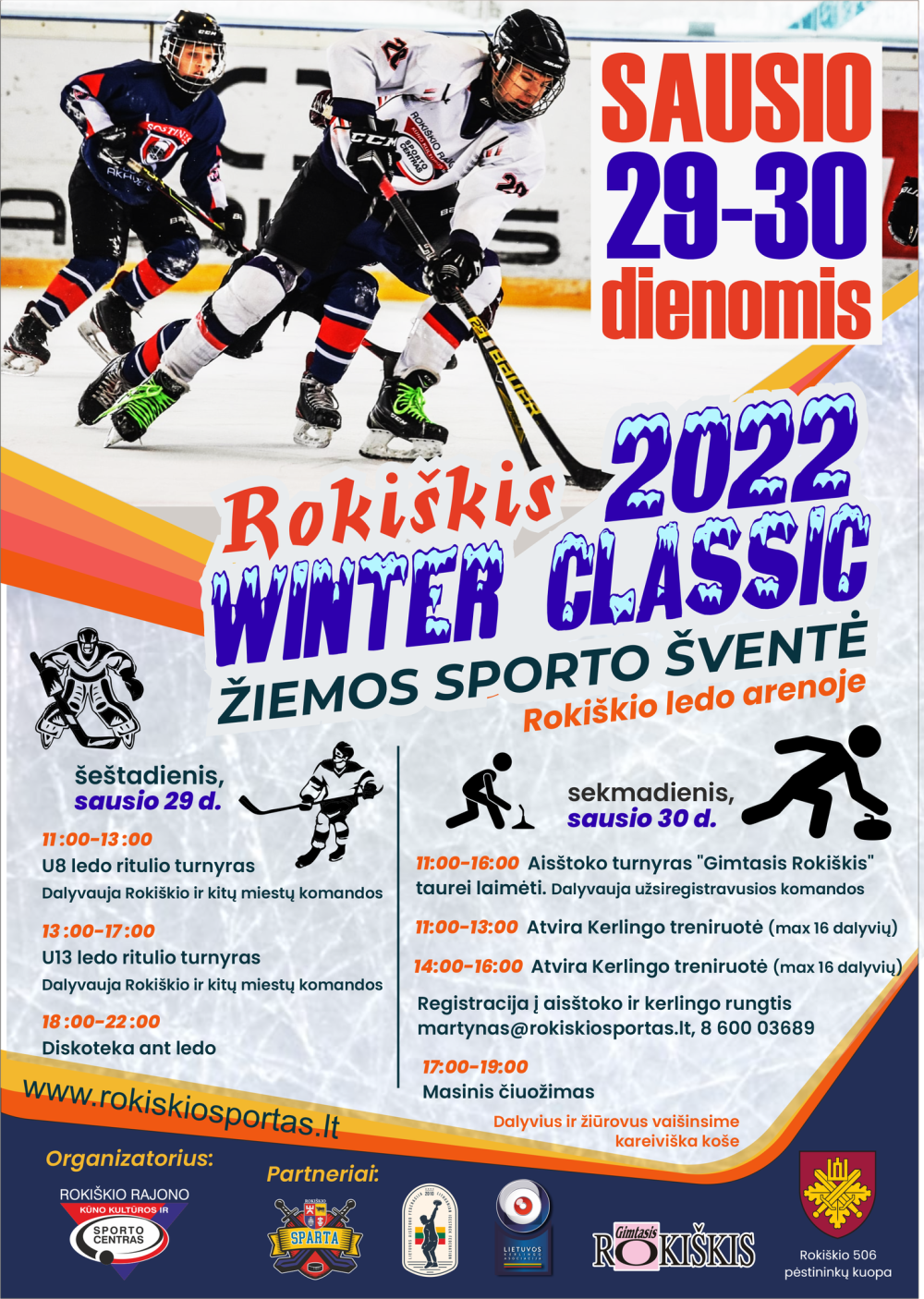 Ateinantį savaitgalį visus besidominčius žiemos sportu ir netik kviečiame į Rokiškio ledo areną, kur vyks žiemos sporto šventė „Winter Classic Rokiškis 2022“. Pirmąją dieną šeštadienį nuo 11 valandos ryto į aikštelę iščiuoš jaunieji ledo ritulininkai, kurie varžysis U8 turnyre. Po jų nuo 13 valandos savo kovas pradės vyresni U13 ledo ritulininkai, o jiems pabaigus varžybas